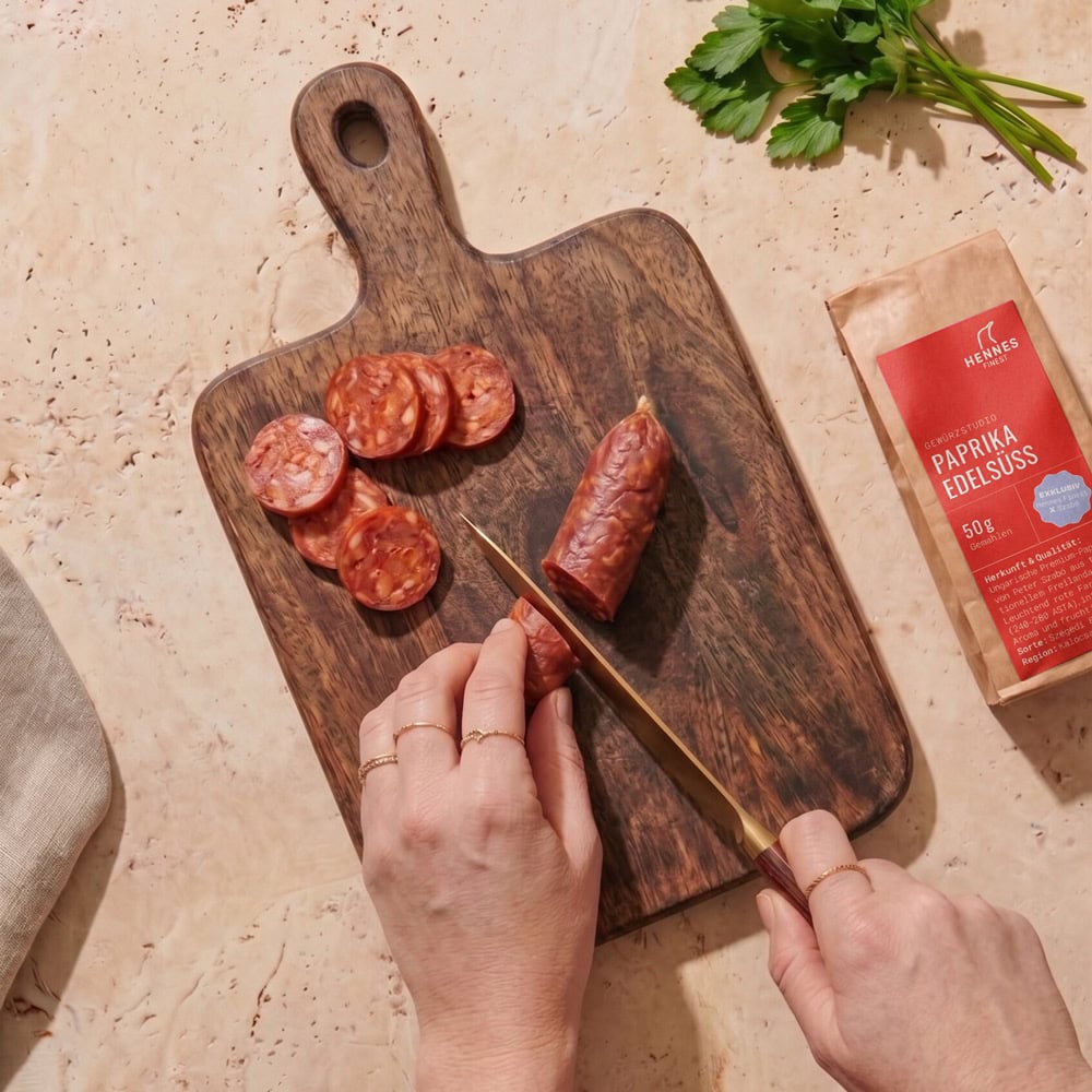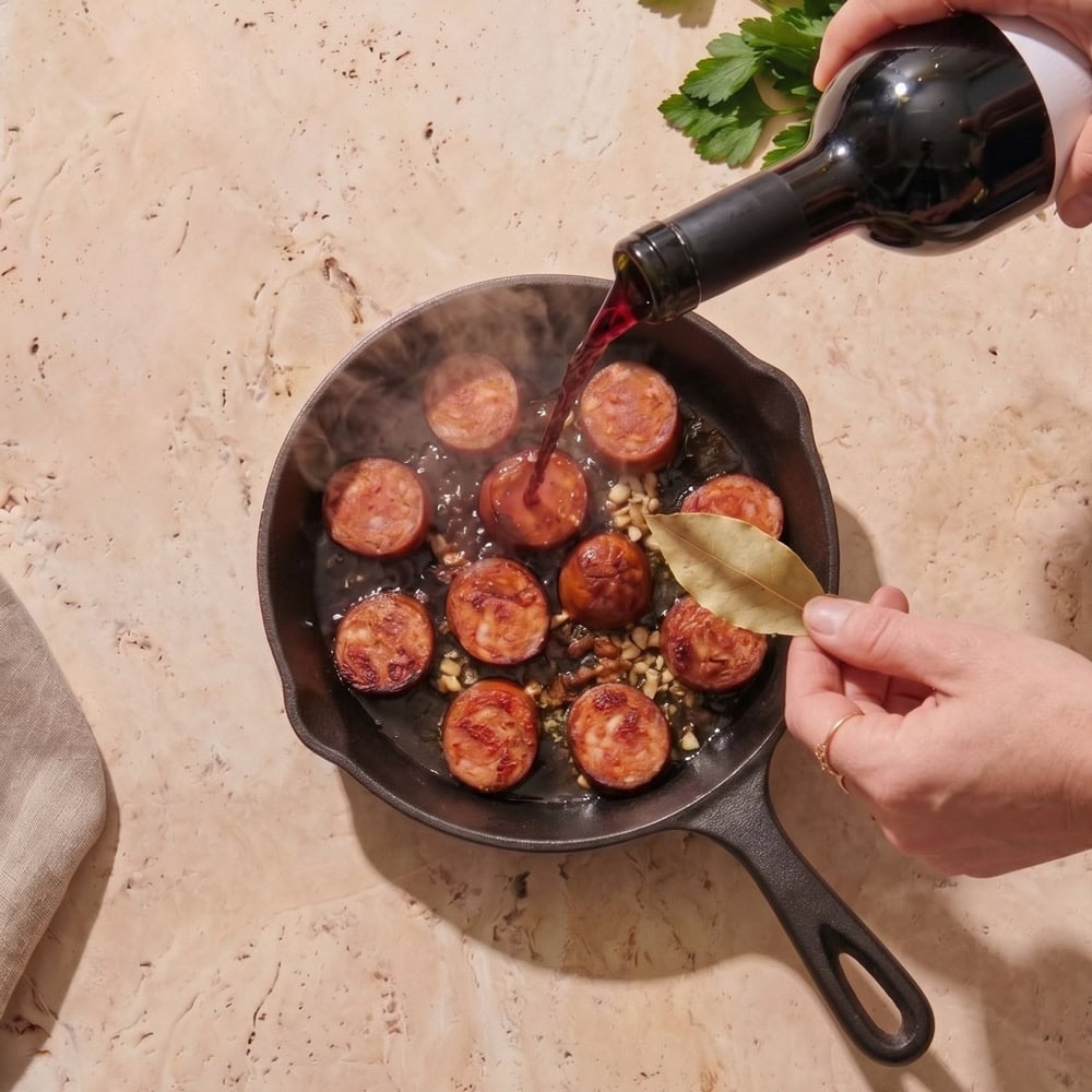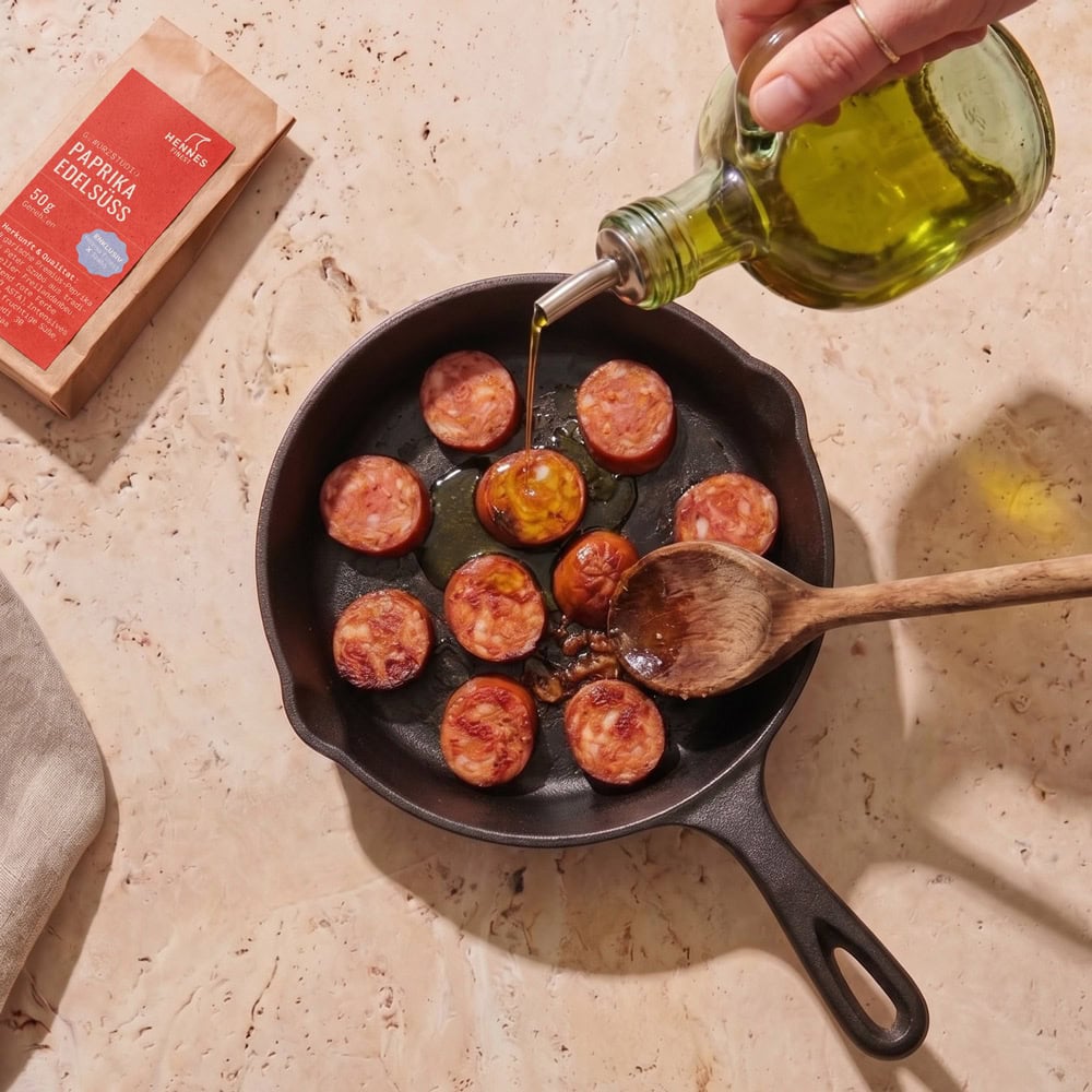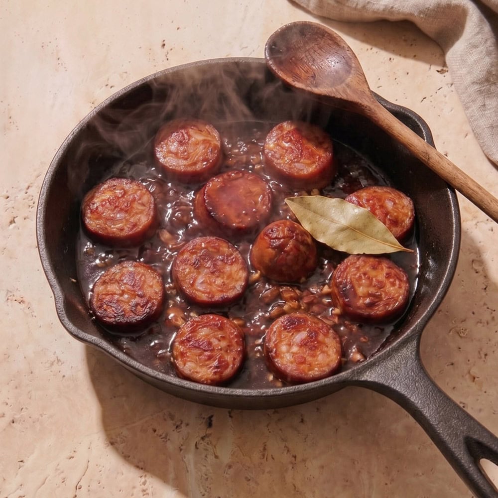 Chorizo al Vino ist ein absoluter Klassiker der spanischen Tapas-Kultur, der durch seine Einfachheit und seinen intensiven Geschmack besticht. Dieses Gericht vereint die würzige Schärfe der traditionellen spanischen Paprikawurst mit dem tiefen, fruchtigen Aroma eines guten Rotweins. Mit nur wenigen Zutaten und minimalem Aufwand ist dieser Klassiker angerichtet. Das geräucherte Paprikapulver gibt dezent eingesetzt, eine besondere Note. Serviert wird die Chorizo al Vino traditionell in einer rustikalen Schale mit frischem Baguette.