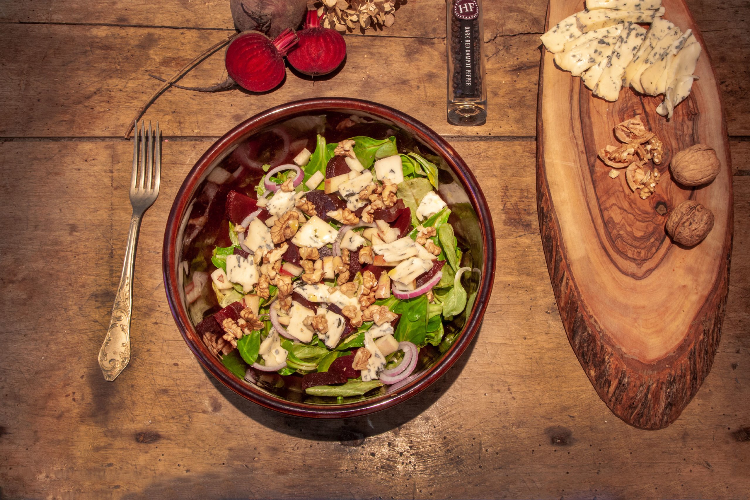 Die südfranzösische Traumkombination auf Feldsalat: Rote Beete, Walnuss, Apfel, rote Zwiebeln, Roquefort-Käse und Dunkelroter Hennes’ Finest Kampot-Pfeffer. Das kräftig-pfeffrige Grundaroma und die süßen Aromen von Honig, getrockneten Pflaumen und Waldbeeren harmonieren perfekt mit dem nussigen, erdig-würzigen Geschmack dieses Salatklassikers aus Südfrankreich. Auch für ein simples Dressing aus Balsamico und Walnussöl muss man keinen Michelin Stern besitzen um die Esserschaft in Hochstimmung zu versetzen. Die Zutaten sprechen für sich!