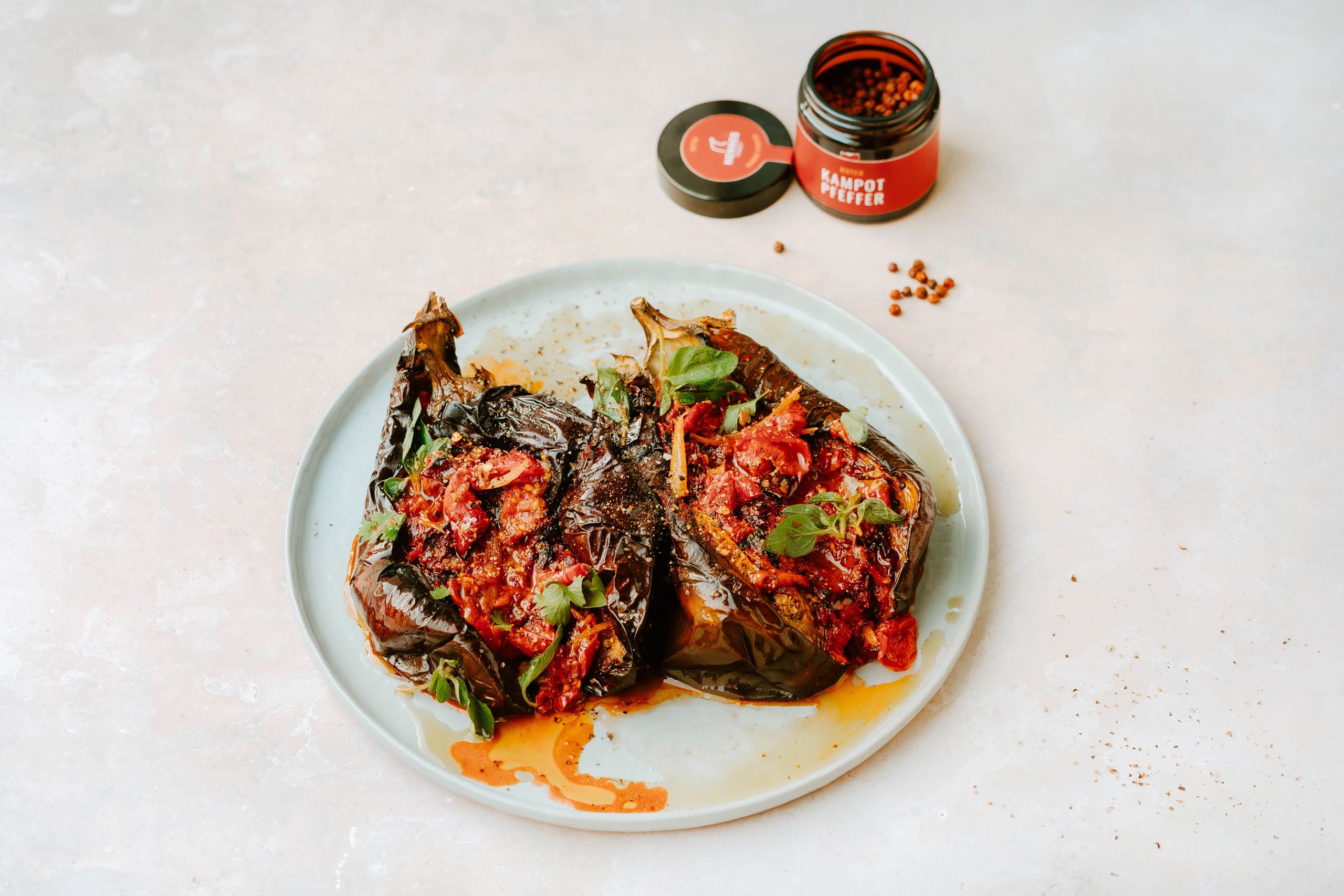 Geschmorte, mit einem Ragout aus Paprika, Tomaten und Zwiebeln gefüllte Auberginen, die nicht nur dem Imam die Schuhe ausziehen. Wörtlich übersetzt bedeutet Imam Bayildi: „Der Imam fiel in Ohnmacht“. Eine andere Übersetzung versetzt den Imam in Entzücken – beides ist wohl als absoluter Glückstaumel zu verstehen. Ganz klassisch werden dafür jeweils der Länge nach vier Streifen Schale von den Auberginen abgeschält, damit sie rundherum wie gestreift aussehen. Es geht aber auch sehr gut ohne diesen kosmetischen Eingriff. Viel wichtiger ist für diesen Klassiker der vegetarischen türkischen Küche beste Gemüsequalität, ein paar herzhafte Umdrehungen mit der Pfeffermühle und allerallerbestes Olivenöl.