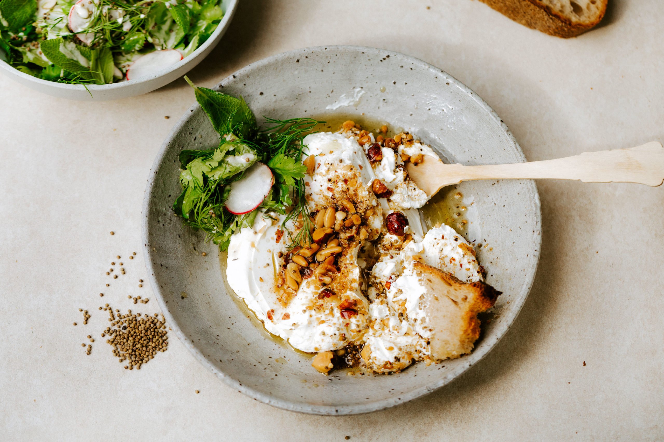 It’s magic: Mit drei Handgriffen wird über Nacht aus einem schlichten Molkereiprodukt ein cremiges, ultraköstliches orientalisches Vergnügen, das sich auf vielerlei Art „aromatisieren“ lässt. Klassisch isst man den abgetropften Joghurt einfach nur mit ganz viel kalt gepresstem Olivenöl und Brot, aber er verträgt natürlich auch ein bisschen Schnick Schnack wie selbstgemachtes Dukkah, aufgemotzt mit Weißen Pfefferperlen, und einen aromatischen Kräutersalat.