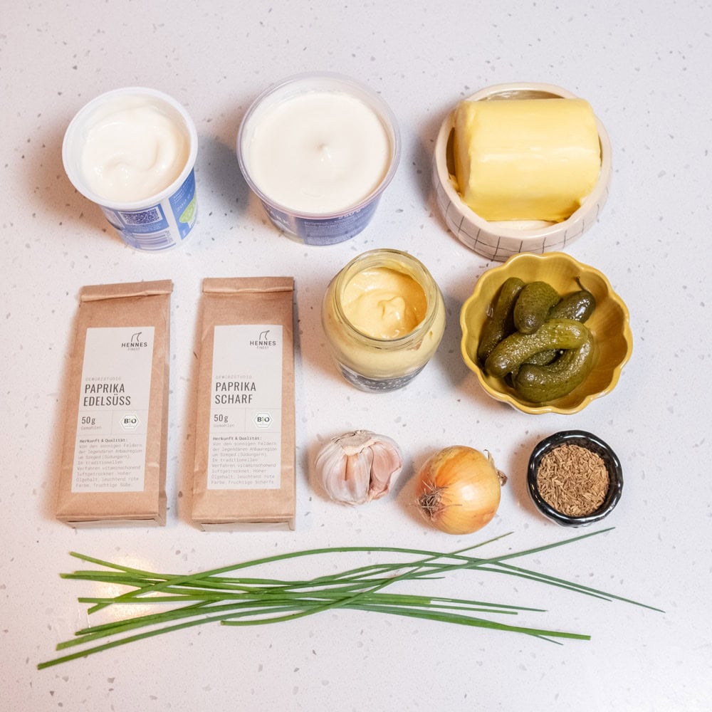 Der Urgroßvater des bayrischen Obatzter. Topfen gibt den Körper, Butter den Schmelz, Paprikapulver mehr als nur die Farbe. Dazu Senf, Kümmel, Zwiebel, Gürkchen – und schon schmeckt’s nach Csárda oder Heuriger. Grenzgänger und Wirtshausklassiker. Wenig Zutaten, viel Charakter. Dazu etwas krosses, z.B. Chips, geröstetes Brot oder knusprige Brezen!