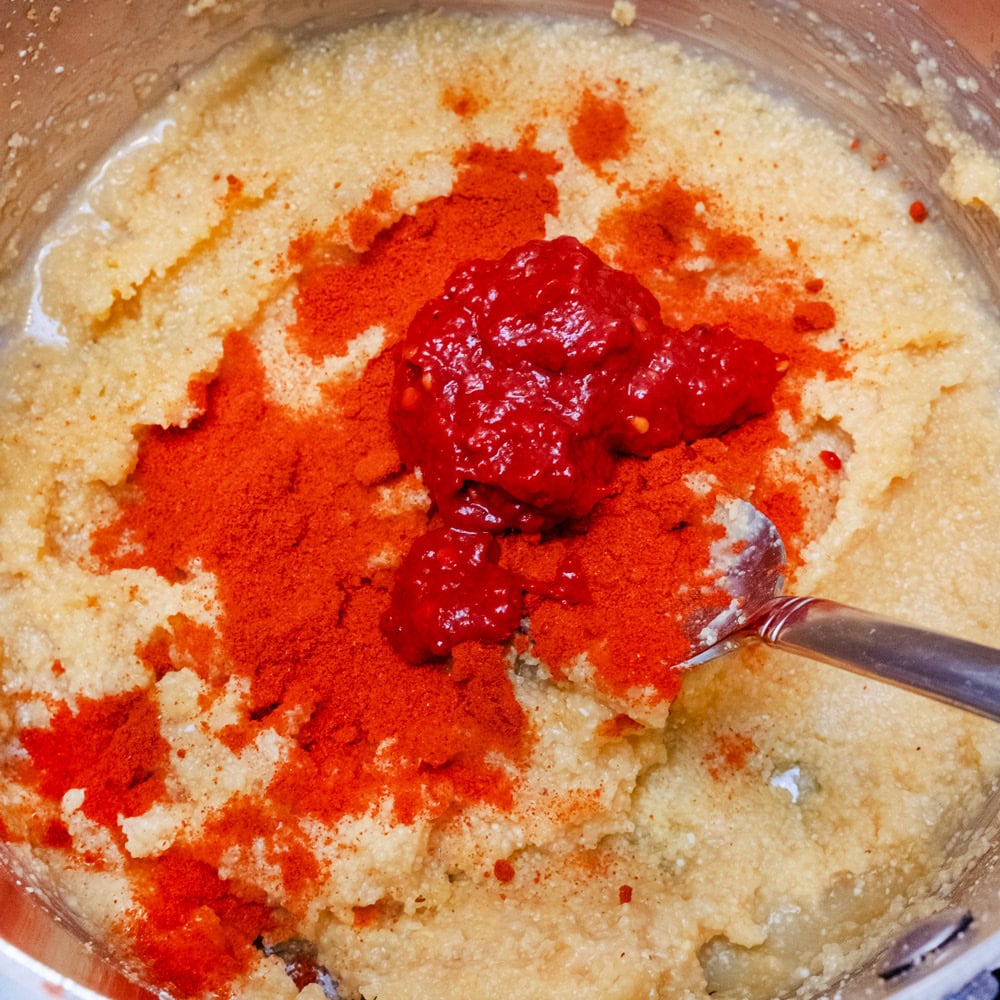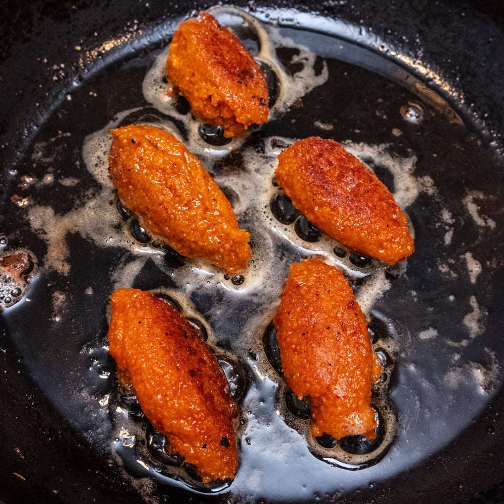 Wenig Zutaten, viel Wirkung: Maisgrieß wird mit Brühe, Butter und Paprikapulver zur samtigen Basis, Parmesan gibt Tiefe, ein Hauch Knoblauch den Flirt. Mit zwei Löffeln geformt und in brauner Butter geschwenkt, werden sie außen leicht knusprig, innen cremig – ideal als Beilage zu Schmorgerichten, Ragù oder gegrilltem Gemüse. Sie bringen rote Wärme auf den Teller, ohne laut zu werden: elegant genug fürs Menü, gemütlich genug fürs Familienessen. Optional mit geräuchertem Paprika für mehr Tiefe oder frischen Kräutern für die Garten-Note.