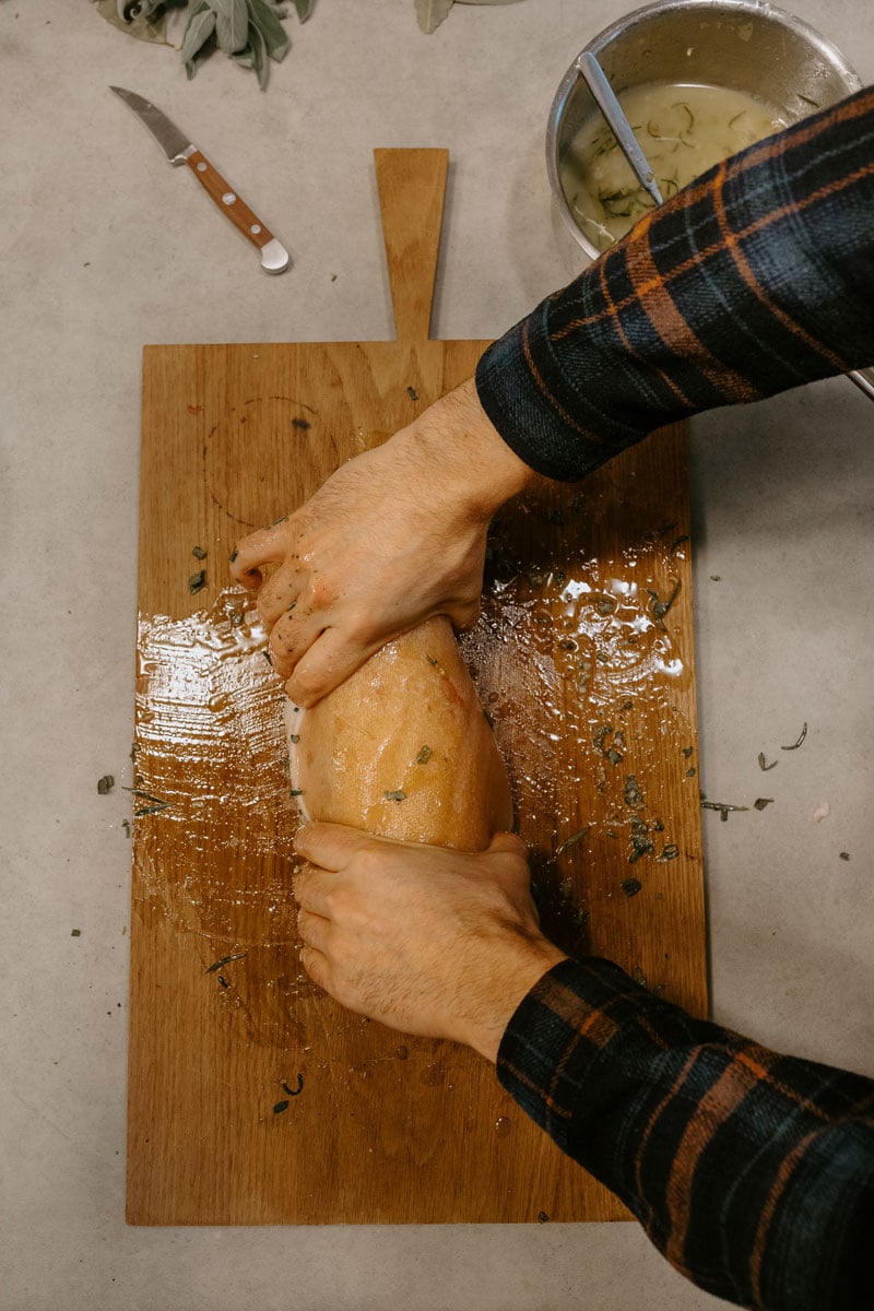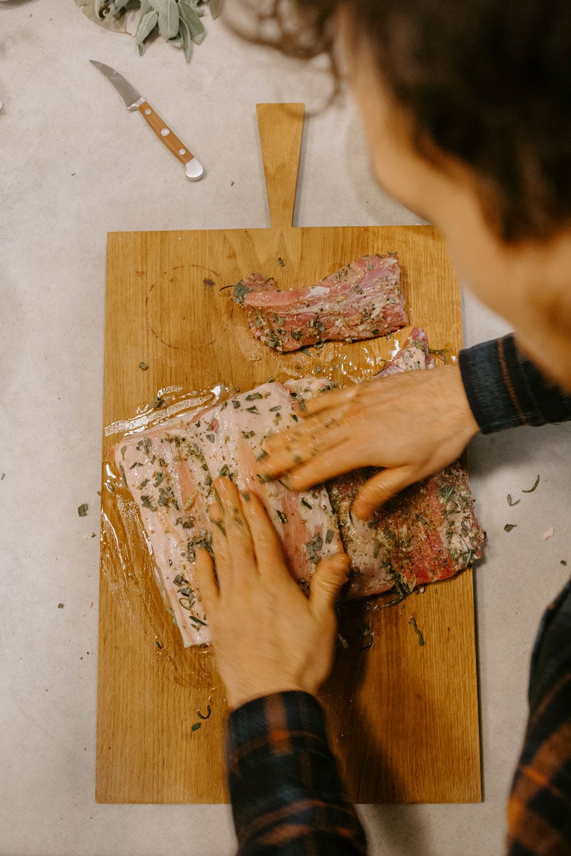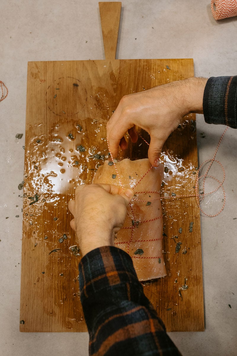 Selbst gerollter, knuspriger Schweinebauch statt Gänsebraten, würzige Rosmarinkartoffeln statt Knödel oder Klöße: Dieses Jahr heißt es bei uns „Buon Natale“. Für unser italienisches Weihnachtsmenü haben wir uns auch beim Hauptgang etwas Besonderes ausgedacht. Porchetta – genauer gesagt Porchetta di Ariccia, also Schweine- oder Spanferkelbraten aus Ariccia, einem kleinen Städtchen in der Nähe von Rom) ist eigentlich ein Klassiker der italienischen Straßenküche und wird traditionell über offenem Feuer auf dem Drehspieß zubereitet – ein panino dazu, das war’s. Für unsere Version darf es ruhig ein bisschen festlicher sein, mit grünen Bohnen und kross gebratenen Kartoffeln. Bei den Aromen sind wir dem Originalrezept natürlich treu geblieben: Dunkelroter Kampot Pfeffer, Knoblauch, Fenchelsaat, Rosmarin und bestes Olivenöl ist im Grunde alles was ihr braucht. Mamma mia che buono! Wir zeigen euch Schritt für Schritt, wie ihr den Braten am Besten vorbereitet, bindet, würzt und gart.