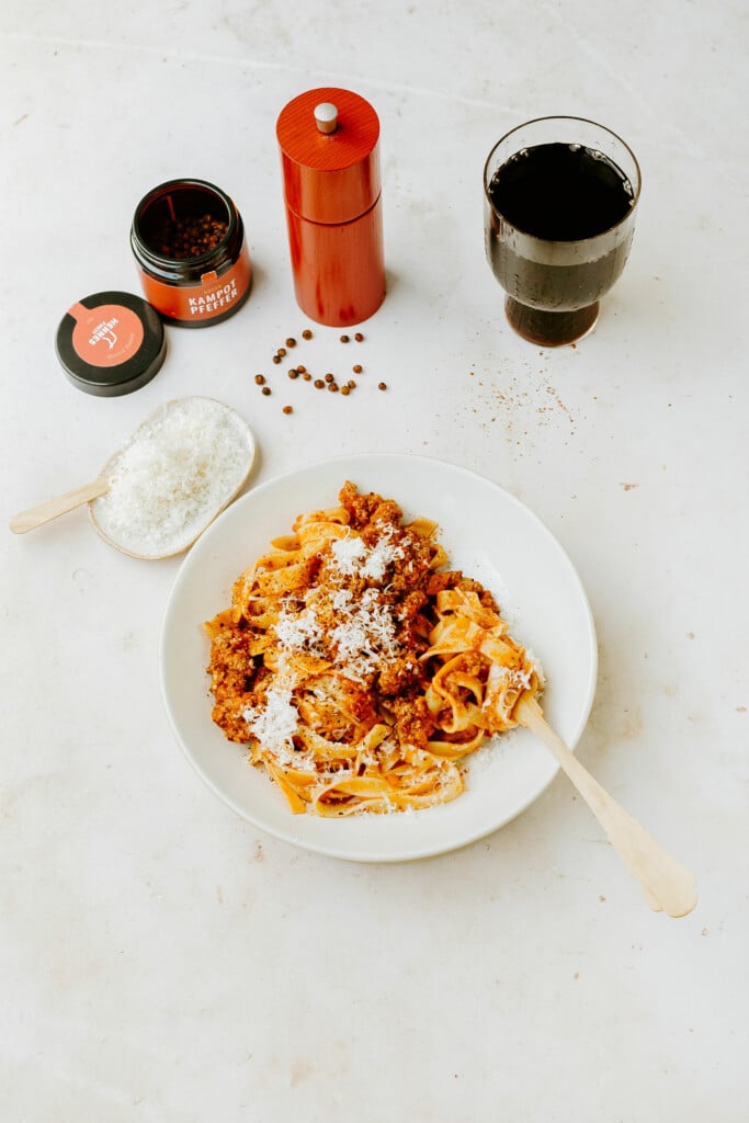 Das Ragù ist ein tolles Spielfeld für die komplex-scharfe und hintergründige Aromatik des Roten Kampot Pfeffers.