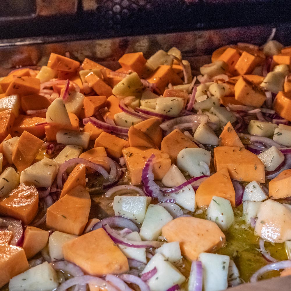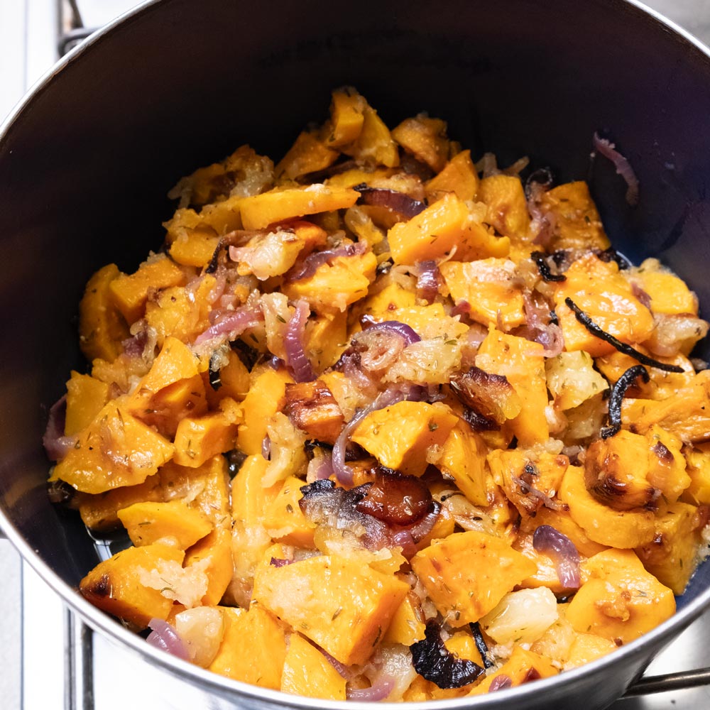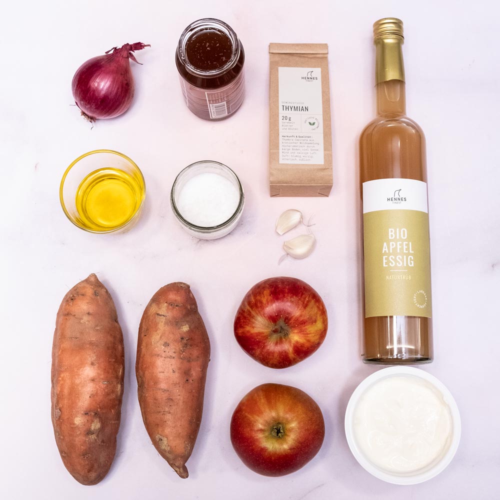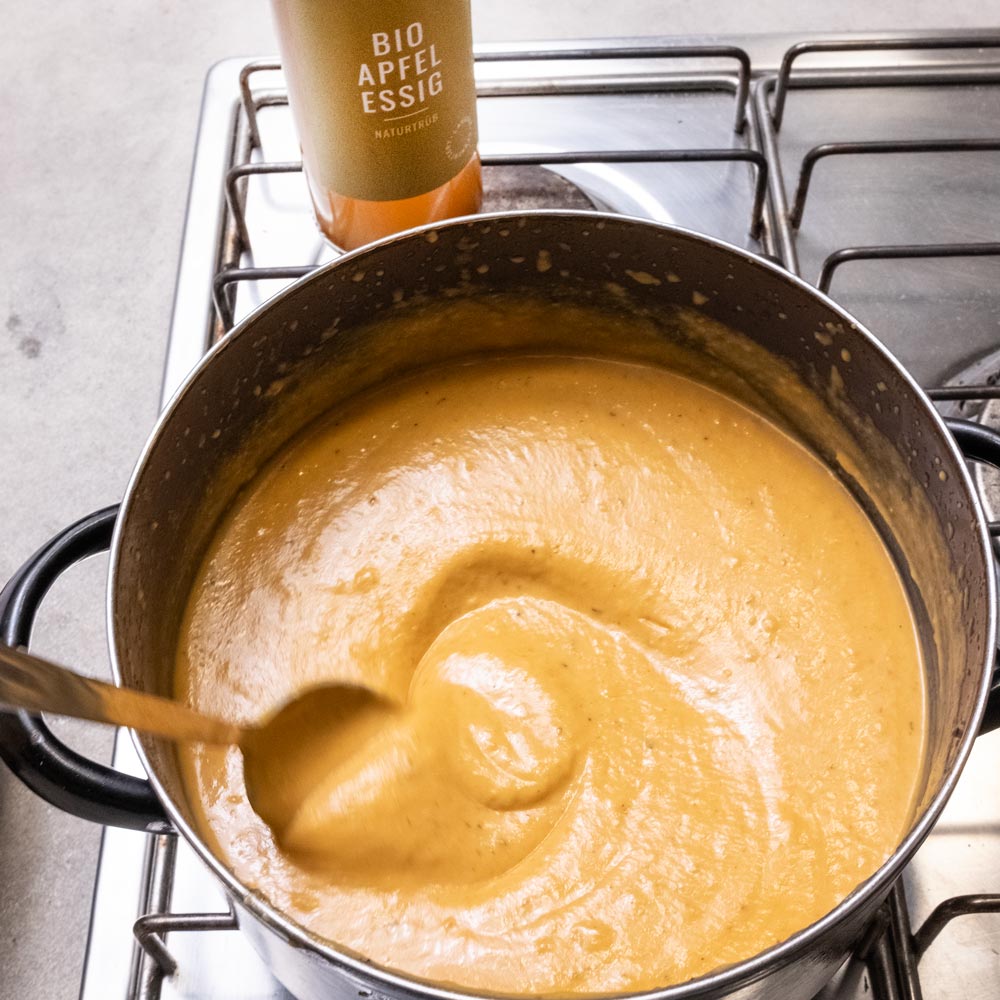 Süßkartoffeln, Zwiebeln, Knoblauch, Äpfel und Thymian werden mit Olivenöl im Backofen geröstet, bevor sie mit Brühe und Apfelessig im Mixer landen und zu einer cremigen Suppe geformt werden. Ein genialer Trick, durch den eine süßliche Suppe mit kräftigem Umami und leichter, säuerlicher Frische entsteht. Geschmacklich ein absolutes Highlight, das die Vielseitigkeit eines guten Apfelessigs beweist.